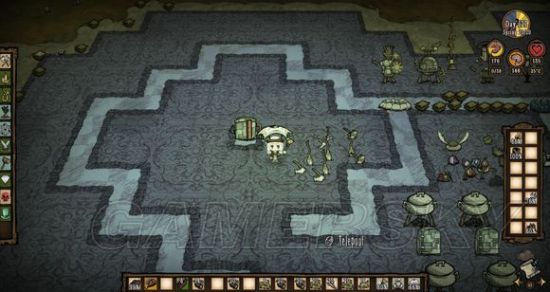 最危险的地方,有大量的触手、蜘蛛、鱼人还有黑池塘,地上有蠕动的跑跑就说明下面有触手,触手伤害很高所以前期没装备必须十分的注意。鱼人窝也是一大特色,走进会主动攻击玩家,但也会和触手厮杀,所以沼泽地上往往会有很多吃的,但要看清地上有没有触手在去拿,别贪了小便宜丢了命。黑池塘黄昏会刷出蚊子,比较烦。建议新手前期别太深入沼泽,遇到就采8个芦苇做鸟笼就行了。