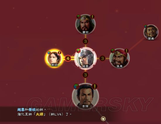 绊系统需要提升好感。而提升好感的方式主要有:帮助做任务(或者拉他过来当苦力),宴会,自己各种牛逼行为触发对方的敬畏迷恋等情感(这种状态下,可以不停谈话直接到80好感),一起打仗(不要忽略这个途径,后期打仗跟他一起夹击什么的,有时候直接从1级绊升到2级,2级升到3级。所以有时候拉关系好的武将一起出去打仗是后期升级绊的不错途径)