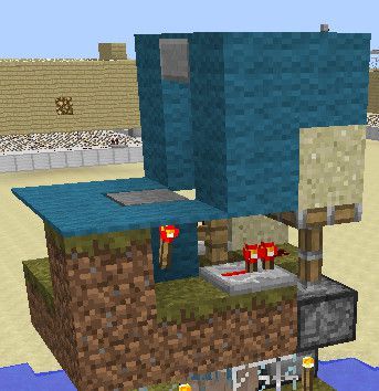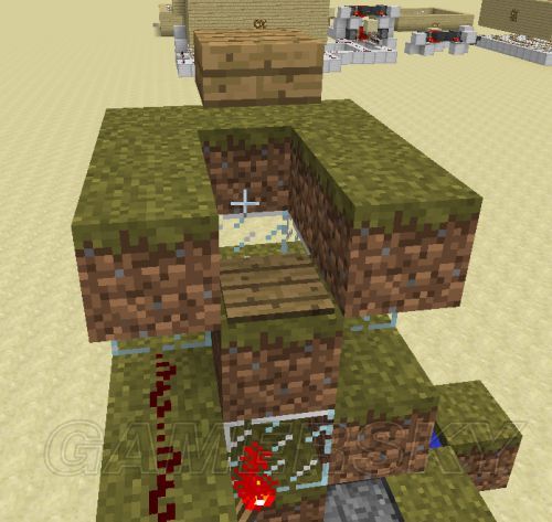 5。为了方便操作,我把按钮移到了地面上,为了把电路完全隐藏,用活塞来做开关。另外可以看到脉冲发生器也被我下移了一格,为了让沙子不露出地面……