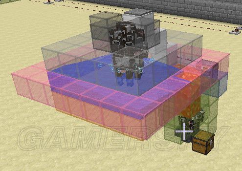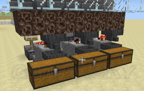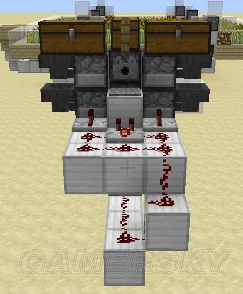 非常值得注意的一点是,同行的发射器的骨粉消耗程度是不一样的,因为作物有可能只需要2个骨粉就可以成熟,会有两个发射器中的骨粉消耗的更快。如果你觉得这几个发射器的容量太小(每个发射器中9个格子,两行发射器可以达到18组小麦/27组胡萝卜/马铃薯的收获),可以用漏斗连接箱子做骨粉补充装置,这些可以自由发挥,不详述了。