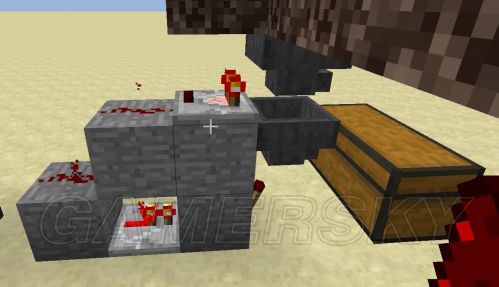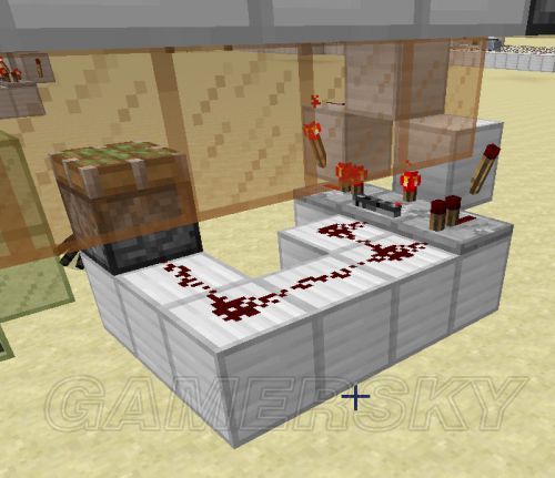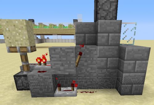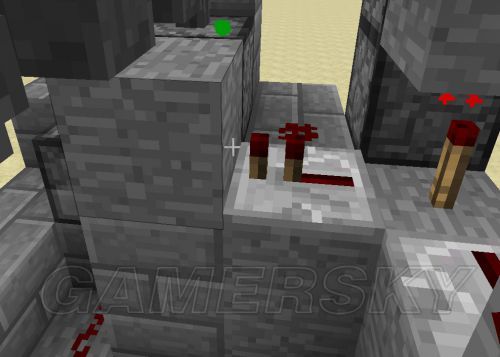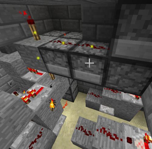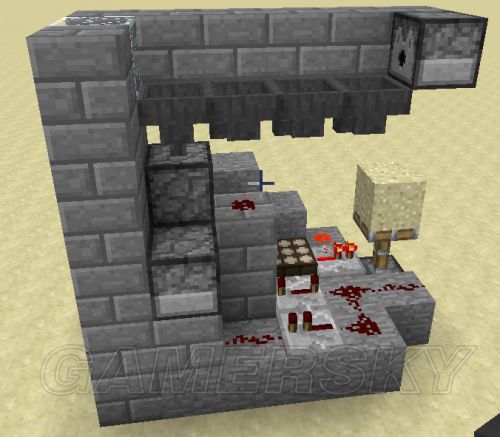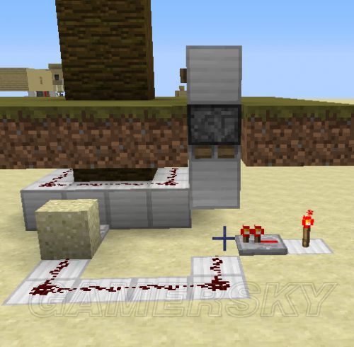 9。激活投掷器用的电路,需要加的是黄点点到的红石粉、红石火把和一个石头