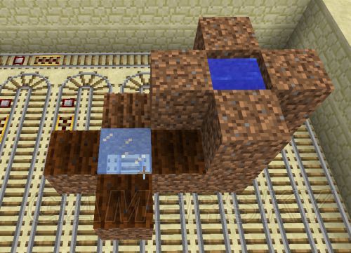 之所以使用静态水是为了让铁路设计更容易,因为如果不用静态水源,水源下方一格就不能放铁轨,设计起线路会很麻烦,如果你没有冰,或者不想冒险使用静态水源,你也可以自己设计一下矿车运行轨道。不过还有个很好的方法是把中心水源提高一格,这样会导致减少4个耕地面积,不过这点损失并没有什么大碍。同样最好把那四个挡水的方块上面再加个方块防止农民乱跳踩坏其他耕地,或者可以用牌子来挡水。