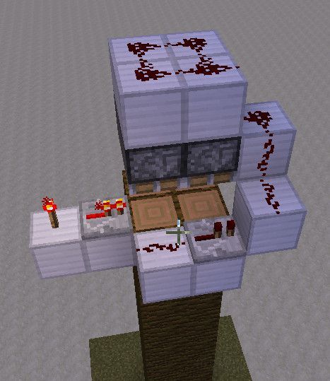 在使用时,人站在踏板上,激活时钟电路,从图中可以看到连接到发射器的信号是2 ticks周期的原始信号,而连接到活塞的信号经过最下面那个4级中继器,变为8 ticks周期。