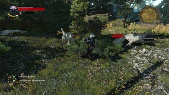 ‘真是个难缠的对手,我得先回村找到森精的宿主才行。’杰洛特收起厚重的怪物图鉴,正准备回村,突然遭到了一群白狼的袭击,白狼拥有残暴的性格和尖利的牙齿,而且成群出没,形单影只的路人很容易葬身狼口——不过对于猎魔人来说,白狼和一般的野狗之间并没有什么区别,杰洛特抽出钢剑,快速地结亚克席之印,让群狼混乱,六神无主,自相残杀,紧接着手起刀落,逐个击破,不一会儿,猎魔人就带着一堆狼皮、狼肉回村了。