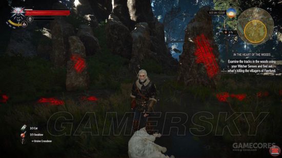 ‘嗯…这里有狼的尸体…满是抓痕,可这些不是致命伤,头骨被打碎了…看来这怪物力气很大呢…’猎魔人经过多年的训练,练就了一对火眼金睛,可以敏锐地发现怪物的痕迹——比如树干上的这些爪印。