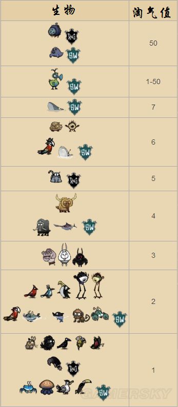 下图是击杀不同中立生物增加的淘气值,每分钟淘气值会自然的下降一点。