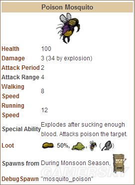 100血3攻击,攻击四次后自爆,自爆伤害34,25%掉落毒腺,50%掉落治疗20血的黄蚊帐,概率为单独计算,即你可能十次什么都没有,也可能次次都毒腺加黄蚊帐。