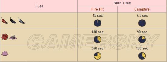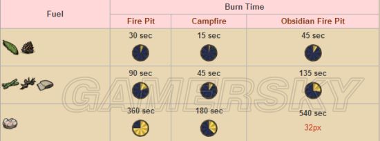 燃料燃烧时间分四级,在火坑火炉中100%燃烧,火堆只有一半的效率,黑曜石火坑1.5倍