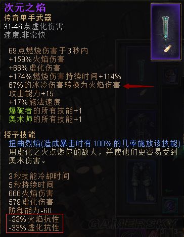 3。核心装备,次元火焰-魔刃(65级紫),阿尔丹纳尔的虚荣-法器副手(50级紫),两件装备都有+1奥术爆破所有技能。次元火焰有XX%冰伤转化为火伤(使得自带-XX%火抗的冰环成为一种输出技能),其特效暴击时100%几率触发-33%火焰虚化抗性,有效提升输出。