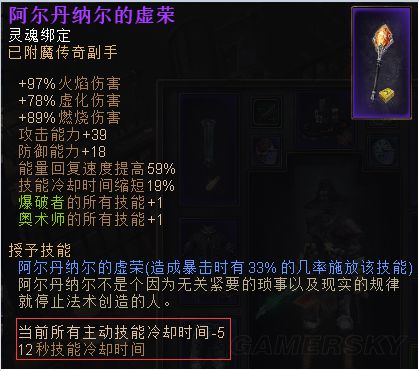 阿尔丹纳尔的虚荣,特效暴击时33%几率(对于有多重打击技能的法师来说,很容易触发)触发减5秒主动技能CD(CD12秒),使得各技能能频繁使用。关键的是,这2件紫装等级都不高,获取容易。关键镶嵌物,剧毒子弹(镶嵌在法器副手上),自带的技能恶性剧毒炸弹,具有-30点全抗性,还有一定的控制效果,法系福音。