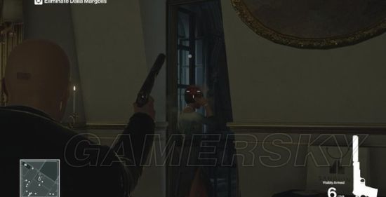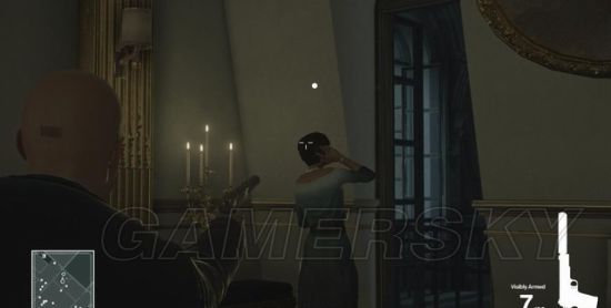 枪杀地点有两个,一个是她的房间或卫生间,你可以潜伏在卫生间,或爬到外面的灯架上用消音手枪射杀。