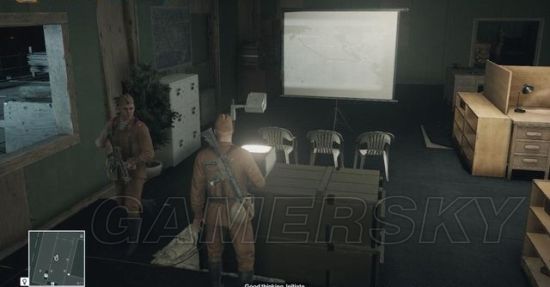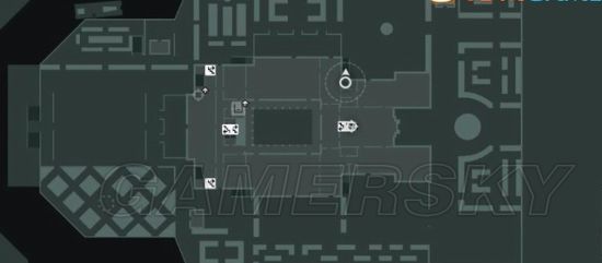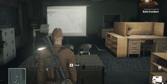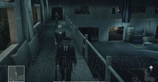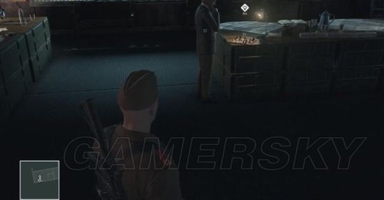现在得上二楼的会见室,有两条路径。一条是由机库的楼梯上去,那里有名能够识破士兵身份的士兵巡逻,不过可利用跟随和货物来避开视线。