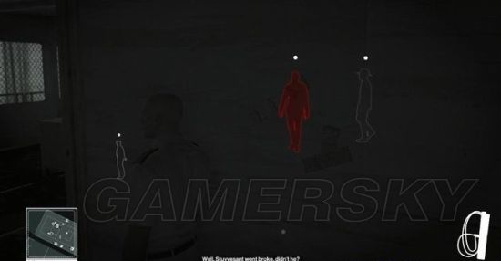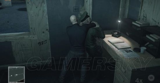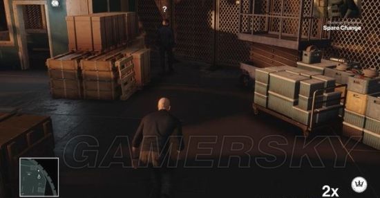 任务开始,由身后绕向基地正门的警卫室。警卫室里有名背对的警卫,而外面的门口还有一名警卫,朝着他身边的汽车位置扔硬币。