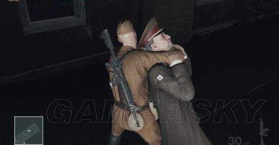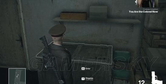 拾取掉在地上的手枪并换上将军的服装,这样在基地就通行无阻了。