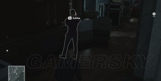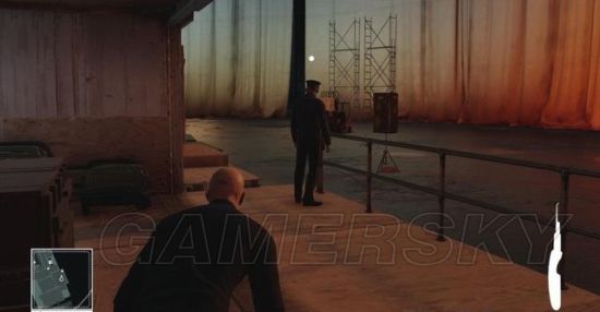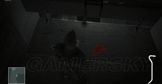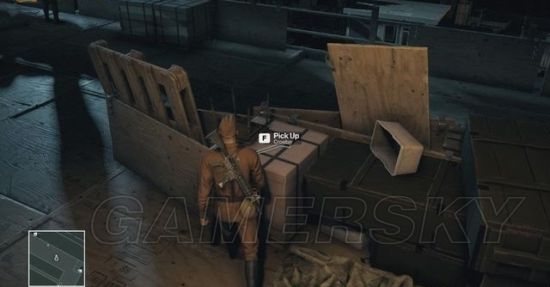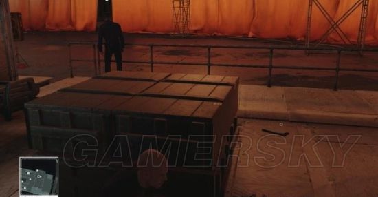 潜入0层甲板后,找到那个背对站着不动的警员,在图示位置放下一把手枪,然后躲在木箱后面。