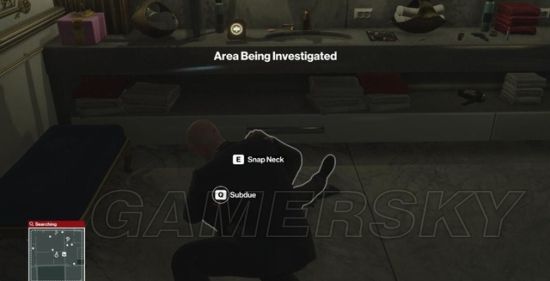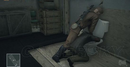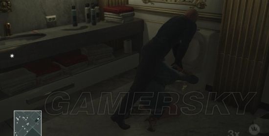 等马格莉斯离开,47潜进她的房间,在卫生间的马桶上取得消音手枪。