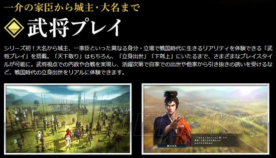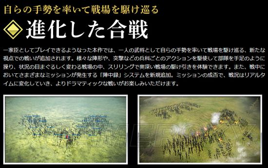 本作既可以以家臣的身份体验,也可以以一个武将的身份率领自己的部下征战沙场,以不同的角度来体验战斗!通过操控各种阵型,兵种等动作来驱使部下,在变化万千的战场中体验真正的战斗吧!还有的是,追加了“陣中録”系统,在战斗中会发生各种各样的任务,任务的成功与否会实时影响到战况,敬请期待激动人心的战斗吧!