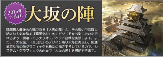 可以体验在战国时代中最大最后的战斗“大阪阵”中活跃且拥有绝大人气的“真田幸村”小故事,准备了关联的剧本和活动。还有就是真实再现了“大坂城”“真田丸”,关联武将们的头像也重现描绘。