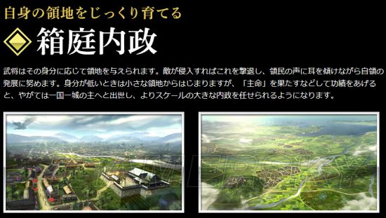 根据武将的身份给予相应的领地,通过击退敌人的入侵,倾听领地百姓的声音努力发展自己的领地。身份越低获得的领土越小,但发展到完成君主的命令,或者发展到一国一城的主人时,可以委托规模更大的内政。