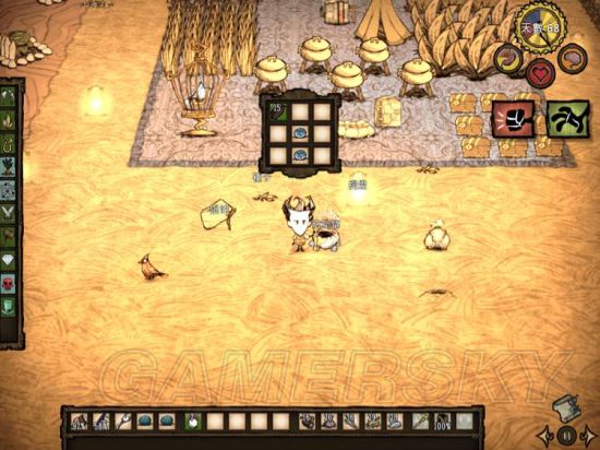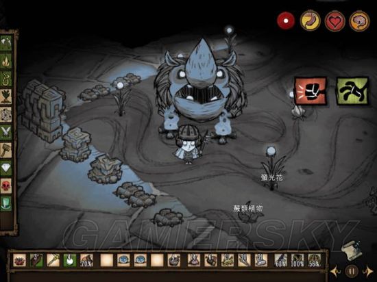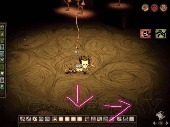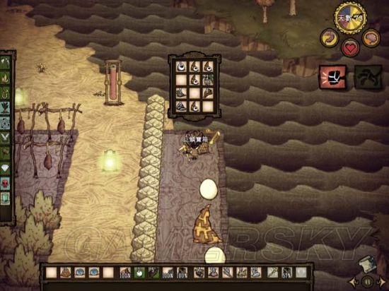 等地面颜色淡了就是暴动结束了,这时候就安全了,我们去找犀牛,一定不能带小切,以免触发蜘蛛,补充好保湿度和血量后就可以出发了。