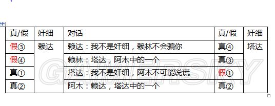 楼主是以塔达为出发点的(赖达也可以),方法是先假设塔达说话的真假,然后判断出奸细是谁,然后确认其他人说话的真假[有顺序],判断标准[只有奸细说了假话,奸细只有一个](图在下)