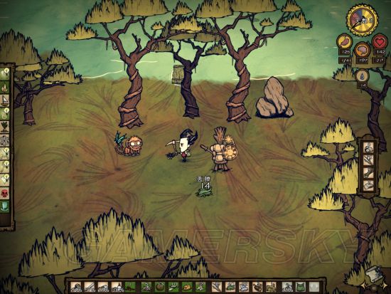 个人非常讨厌的生物之一,又爱又恨,因为他会偷取玩家採集的物品,以及吃光浆果,夜晚的时候偶尔会睡觉,有目标的时候,像喝蛮牛一样睡不著,玩家跑到海上之后他就会跑走,或是觉得无聊没搞头,就会跑开了....会吃浆果丛