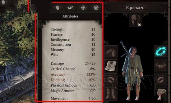 装备栏可直观的看到当前穿戴的服饰衣甲和武器装备。