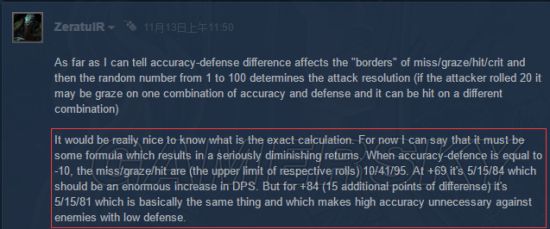 然而,在本作中却采取了一种完全不同的机制。在本作中,命中对防御的优势呈边际收益递减趋势,但无论如何高或者如何低,却都只是在移动擦伤/命中/暴击区间的边界值。这也就意味着,无论你的命中多高,都会有miss;同时无论你的命中多低都会有暴击。