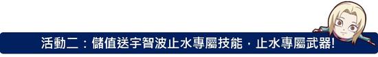 另外,游戏为了推出“宇智波止水”,准备了一系列活动,只要参与活动并蒐集活动道具,就可以免费兑换“宇智波止水”与“宇智波止水”专属技能,止水专属武器!想要获得超强战力的“宇智波止水”千万不能错过本次活动。