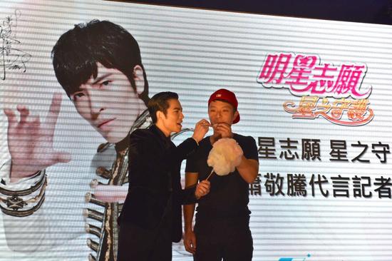 而节目最高潮是现场考验萧敬腾的演技,萧敬腾应主持人的要求,邀请台下观众上台重现电视广告中的精采桥段,其中,一段剧情为饰演着经纪人角色的萧敬腾为身陷魔掌的旗下艺人而挺身英雄救美的桥段,害羞的萧敬腾面对热情的玩家,频频笑场,让台上饰演艺人的玩家也跟着笑场起来,逗趣的互动,让现场笑声不断!而另一段青梅竹马的两人,男主角喂女主角吃棉花糖的桥段,更是电翻所有女性玩家。其中一位幸运的女性玩家上台饰演女主角,萧敬腾深情款款的眼神望着女性玩家,慢慢的喂她吃棉花糖,羡煞不少台下观众,更让女性玩家兴奋不已,开心的说,这辈子应该不会爱上其他男人了!整个活动就在尖叫声与笑声不断中,欢乐圆满告一段落,为“明星志愿-星之守护 萧敬腾代言记者会”画下最完美的回忆!