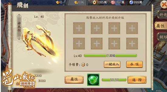 角色80级时将开放飞介面中的‘属性’功能,透过消耗游戏中的各类装备小材料或参加‘80级天门剑阵’闯关获得不同等级的‘古剑精魄’来提升飞剑的经验值,而升级后也将大幅增加角色属性和飞剑的移动速度。