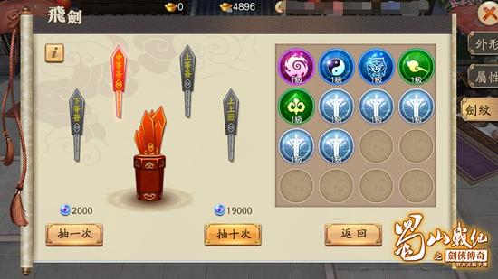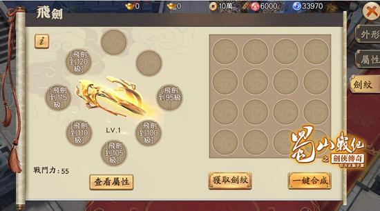 当角色等级升等至90级时,即可开启‘剑纹养成系统’,并以‘抽籤’的玩法来获得‘剑纹’。‘剑纹’共分为白、蓝、绿、紫和橙品质,品质越高属性越高,使用消耗‘剑纹’后提升等级则可以获得属性加成,一般飞剑先开放两个剑纹槽位,之后随着飞剑的等级提升能够获得更多的槽位。