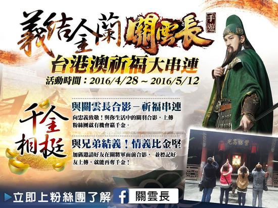 祈求《关云长》开战顺利!记者会现场在蝴蝶数位娱乐执行长胡龙云,与游戏代言人何润东气势磅礡的击鼓声中,正式宣布游戏公测上市,同步启动台港澳地区祈福大串连活动,玩家只要拍下自己与忠义象征‘关云长’的合影,上传官方粉丝团活动串,就有机会一举得千金,邀集好友一同结义入镜,还能再夺千金,助玩家在闯荡三国的过程一路虎虎生风,豪气扫千军!