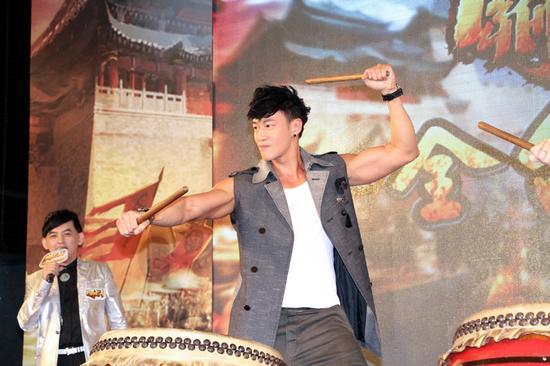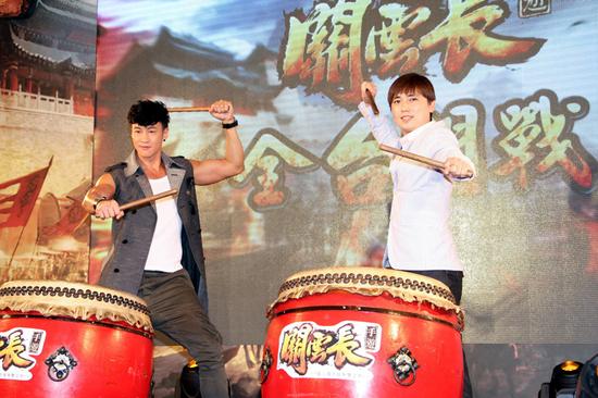 何润东与蝴蝶数位娱乐执行长胡龙云(图右)一同击鼓启动台港澳地区祈福大串连活动
