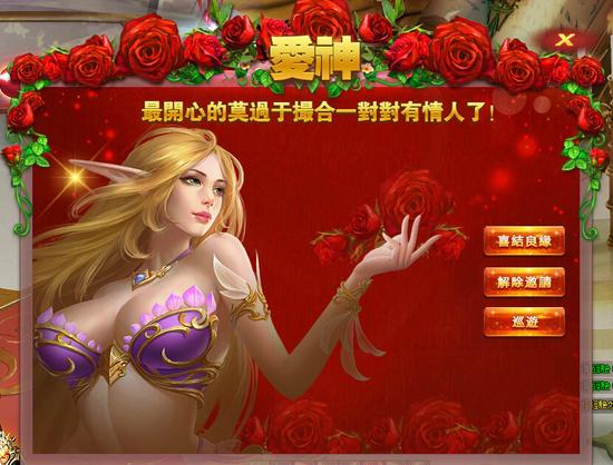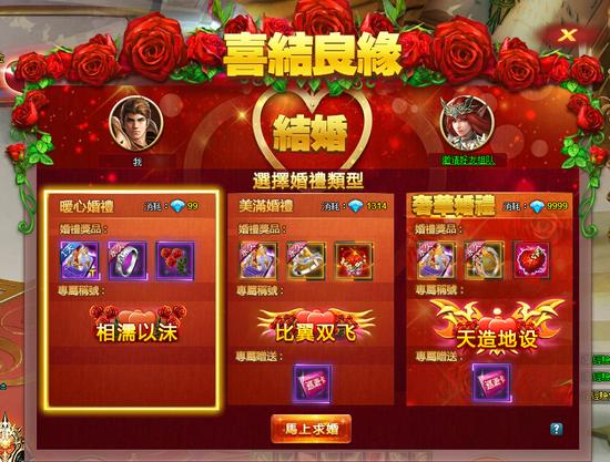 当好友的亲密度达到999,前往主城中找NPC“爱神”,选择喜结良缘,便可向心仪的他/她求婚。只要对方同意,即可结成连理。表达爱情象征的戒指是不可或缺的。不同等级的婚戒代表着各种不同程度的爱,越是高级的戒指,代表的情谊越深之外,同时结婚后获得的称号也会越高级、更受人瞩目!