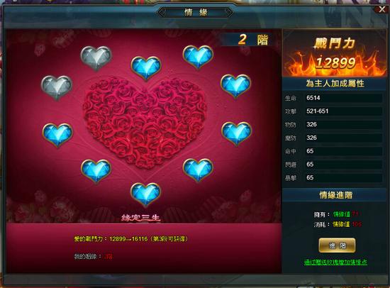 结婚后点击人物,选择情缘值打开情缘界面,即可通过赠送玫瑰增加情缘值。情缘值可用于情缘进阶,增加爱的战斗力数值,更可给予角色增加属性,提升最大战斗力。