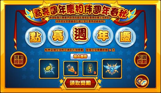 时间开始倒数,一年一度的周年活动也正是展开,首先映入眼帘的是每年都会有的点灯仪式,玩家只要于活动期间内登入《赛尔号》完成任务目标,将此次主要的标语点亮,即可领取丰富的活动奖励,而只要成功点亮所有的标语,还可以额外得到特别奖励!时间有限,快把握时间来把奖品都带走吧!