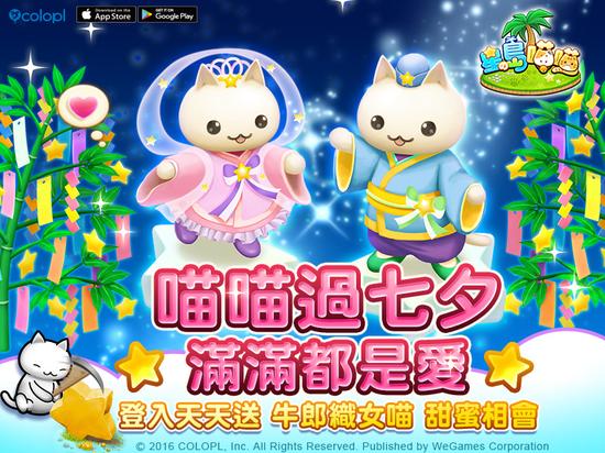 一年一度的中国情人节‘七夕’,传说是牛郎织女这对恋人在迢迢银河相隔之下,唯一可以在鹊桥上相会的日子。初来乍到的喵喵们听到这样的爱情故事都感动不已,决定要在这浪漫时节里以牛郎织女的故事为主题,尽情装扮星之岛!游戏于七夕情人节当天开放牛郎喵喵服饰与织女喵喵服饰,让喵喵们不用相隔广阔银河系,在星之岛上就能一吐相思之情。此外也开放了七夕限定、浪漫花朵与甜蜜爱心系列道具,喵喵们可以尽情展现内心罗曼蒂克的灵魂,把满满的爱意布满整个小岛,用闪烁著爱情光的星之岛一同祝福天下有情人终成眷属!