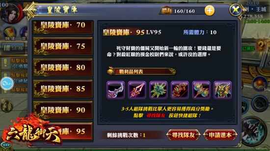 在《六龙御天》全新改版资料片‘画龙点睛’版本中,等级上限将开放至100等,并同步开放95等级的‘皇陵偏殿’副本及‘皇陵宝库’副本,同时也将开放宠物、角色装备、马具相关等级上限。此外,在锁妖塔中将会新增关卡第14层‘迷宫探宝’,而少侠们在进行‘名将试炼’副本时,更有机会获得新东周卡牌哦!