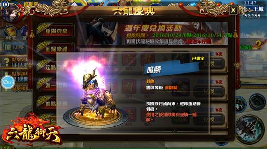 另外,少侠于周年庆活动期间内,完成每日任务即可获得‘六龙令牌’,即可透过‘六龙令牌’进入到特殊副本‘伏龙秘境’,成功击败六龙GM形象的NPC,就有机会获得‘激’、‘情’、‘六’、‘龙’、‘感’、‘谢’、‘有’、你’八个字的字牌。完成收集整组字牌的玩家即可进行奖励兑换,就有机会获得稀有坐骑‘暗麟’。