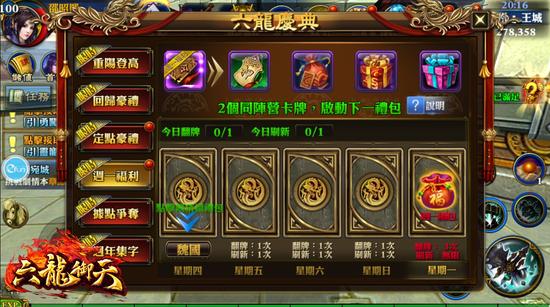 每周四至下一周周一,玩家每天可进行一次翻牌,周一翻牌机会有三次。卡牌分别分为魏、蜀、吴三个阵营,少侠们于每天翻牌前可以进行阵营竞猜活动,竞猜成功的少侠即可获得当天礼包奖励。特别要注意的是于周一,玩家可以进行三次翻牌操作,扣除周一当天的牌,少侠们可以对其它日期未翻的牌进行操作。每周一系统将会根据所有的翻牌阵营组合确定领取的周一礼利内容,当相同阵营的牌越多,奖励就会愈高。