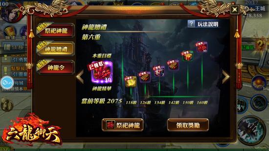 迎接周年庆的到来,《六龙御天》推出一系列好康活动要与少侠们一起庆祝周年。少侠们于10月21日起活动期间内,即可参加期间限定‘神龙降世’活动。王城中将会出现神龙左使者和神龙右使者,其中神龙左使者将会发放6个一次性任务,神龙右使者则会每天发放‘神龙使的委托’,参与并完成任务的少侠们,即有可获得神龙精华奖励。