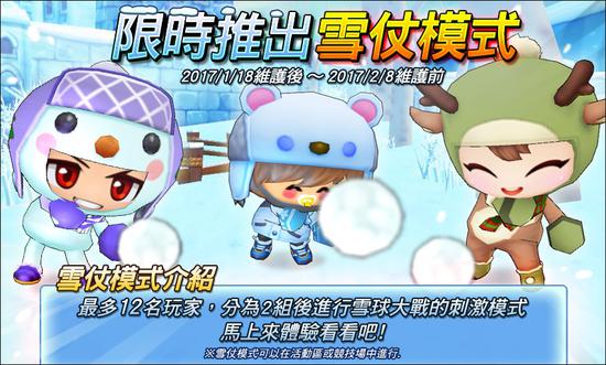 《泡泡大乱斗》在2017年一开始就推出新玩法与台湾及港澳地区玩家见面,从眀(18)日起期间限定全新‘雪仗模式’将最多能和12名玩家一同组队,并展开激烈竞争。玩家在‘雪仗模式’中获得固定的雪球数量,且须避免遭受到对方的雪球攻击。只要被雪球击杀后将会立即死亡,并可于随机地点复活,重生后将会立即进入游戏,继续战斗至时间结束为止。游戏结束后系统将统计双方队伍的击杀总数,击杀数较高的那方将赢得胜利。为欢庆全新‘雪仗模式’上线,同步推出专属活动‘雪仗派对’大幅提升游戏趣味度,1月18日起至2月8日维护前,活动期间内只要登入游戏并进行雪仗模式,将有机会获得活动专用服装‘雪人HC’等众多精美虚宝好礼。