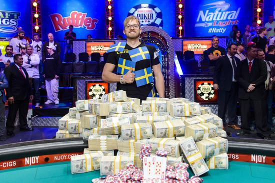 2014世界扑克锦标赛上,27岁的瑞典人马丁·雅克布森击败所有对手,赢走1000万美元的现金奖励。而雅克布森的妈妈称之前雅克布森在一家餐馆里当厨师,每天当他结束工作回家时已经是深夜,夜里只能网上玩扑克游戏打发时间,这个习惯让他赢得今年世界扑克锦标赛冠军,并拿走1000万美元奖金。