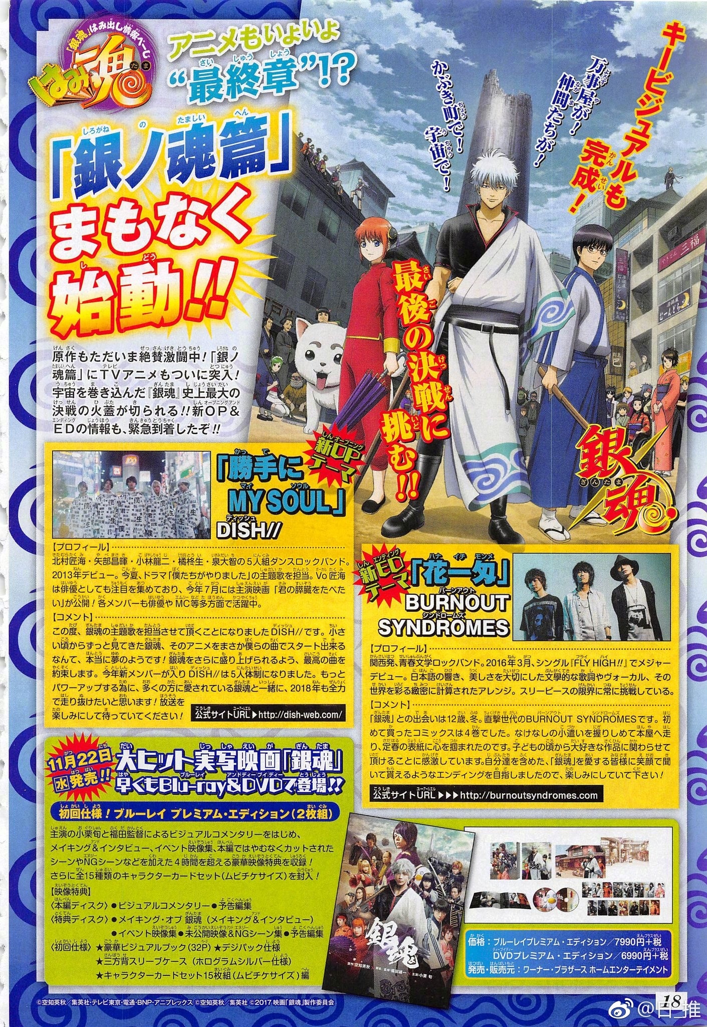 此前由空知英秋创作的原作漫画《银魂》也已经进入了《银之魂篇》中的决战阶段,很有可能将会在2018年内正式完结。而动画版《银魂》的故事进度一直是快于漫画版的,不知在剧情方面是否会有些许变动。