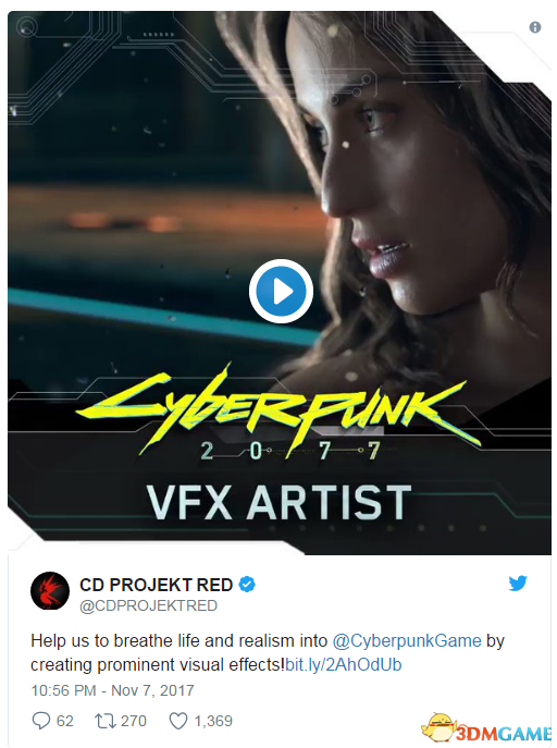 日前官方在推特上发布了一则招聘信息,招募一位VFX视觉特效师,官方在招聘信息中写道:“我们需要一位对游戏极度热爱,并且能够让游戏角色,场景栩栩如生的高手”。制作组需要一位角色,环境建模特效师,来为《赛博朋克2077》担任设计工作。