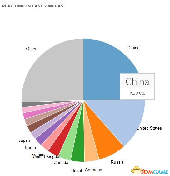 近日根据SteamSpy的最新统计显示,过去两周,Steam上中国活跃玩家数量和游戏时长均完爆其他国家,位列第一。数据显示过去两周,中国活跃玩家数量占据了Steam活跃玩家数的19.48%,美国则以14.71%位列第二。游戏时长方面,过去两周中国玩家游戏时长以24.88%的占比排在第一,位居第二的美国玩家游戏时长占比13.66%。