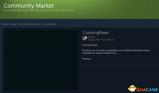 从昨天开始,Steam用户就发现有些不对。在国外论坛上有玩家已经开始讨论,青蛙佩佩的表情开始从道具栏和个人展示列表中消失。列表还在,但图像没了。很长时间以前,这些图标就已经不在聊天界面和发帖界面展示了。现在玩家通过《苍蝇弗格斯》和《美国再度伟大:总统川普》这些游戏所能获得的成就里青蛙佩佩的图像被一段文字替换了,上面写着:“表情图像因Matt Furie主张的DMCA法案保护而暂时不可用。”