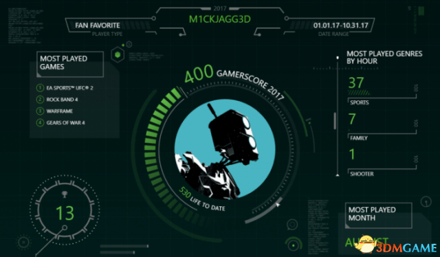 2017 Xbox Year in Review年度回顾页面包容的数据非常丰富,与玩家Xbox Live黄金会员相关的一切成就都被罗列其中,而且界面非常动态,Xbox标志性的绿色为主色调,展示各类游戏数据和成就等等。