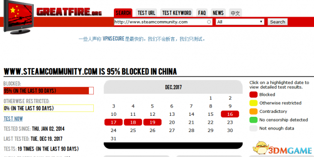 对此小编从相关查询网站发现,从本月16日开始到现在,Steam社区就已经被屏蔽,通过正常途径无法访问: